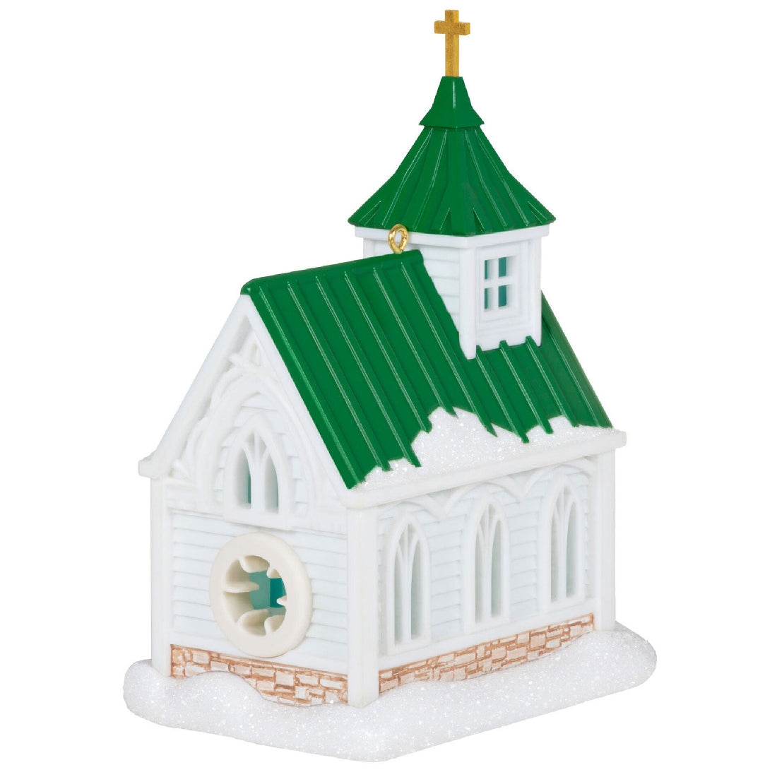 A beautiful representation of a heart full of faith, this Christmas tree ornament features a charming church with green roof and steeple surrounded by a dusting of glittery snow. Insert the bulb of a standard miniature light string through the rubber grommet on the ornament to create a special lighting effect.