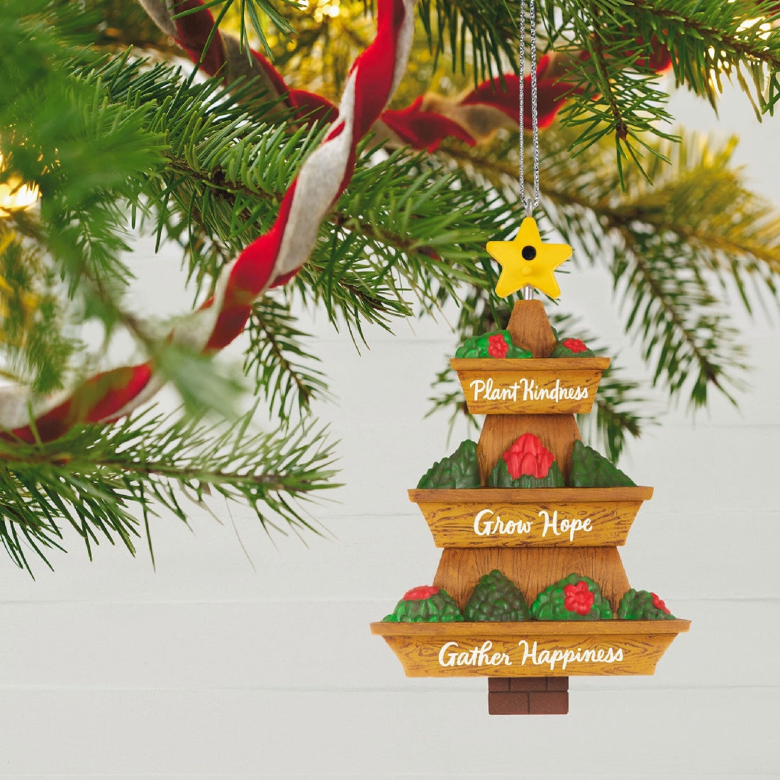 Give an avid gardener this Christmas tree ornament and plant kindness in their holiday season. A thoughtful message decorates the tiered garden planter that resembles a wooden Christmas tree and is topped with a yellow star-shaped birdhouse.