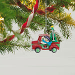 Continue the holiday parade with this Nello's Music Shop truck Christmas tree ornament. Featuring a sweet snowman behind the wheel, this whimsical truck hauls a guitar shaped like a Christmas tree with a star at the headstock.