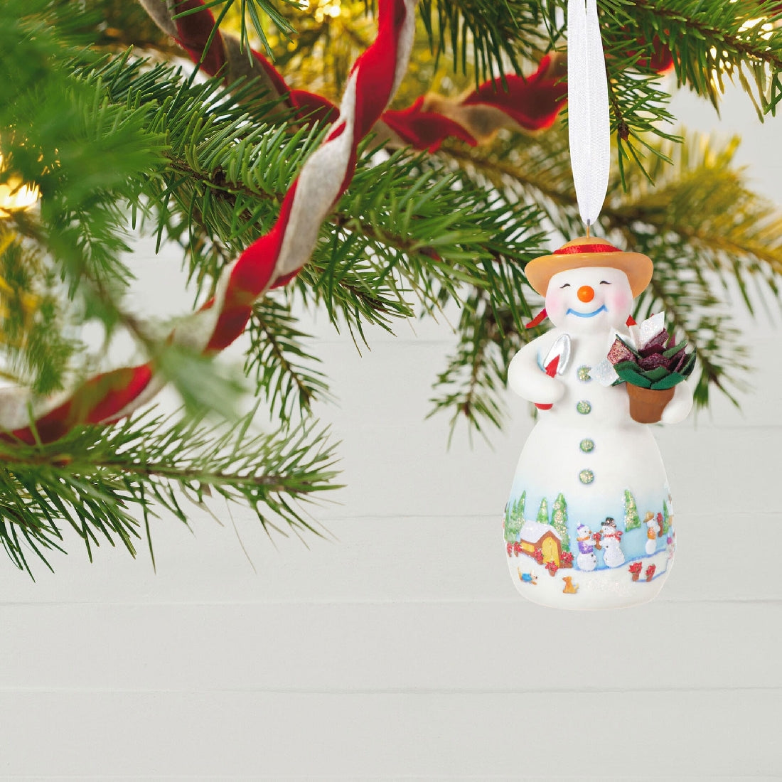 Celebrate your gardening hobby or give this Terran S. Gardner Christmas tree ornament to your favorite green thumb. The porcelain snowman, wearing a gardening hat, holds a flower pot and trowel while a glittery scene of snowmen decorating their landscape with poinsettias adorns the base.