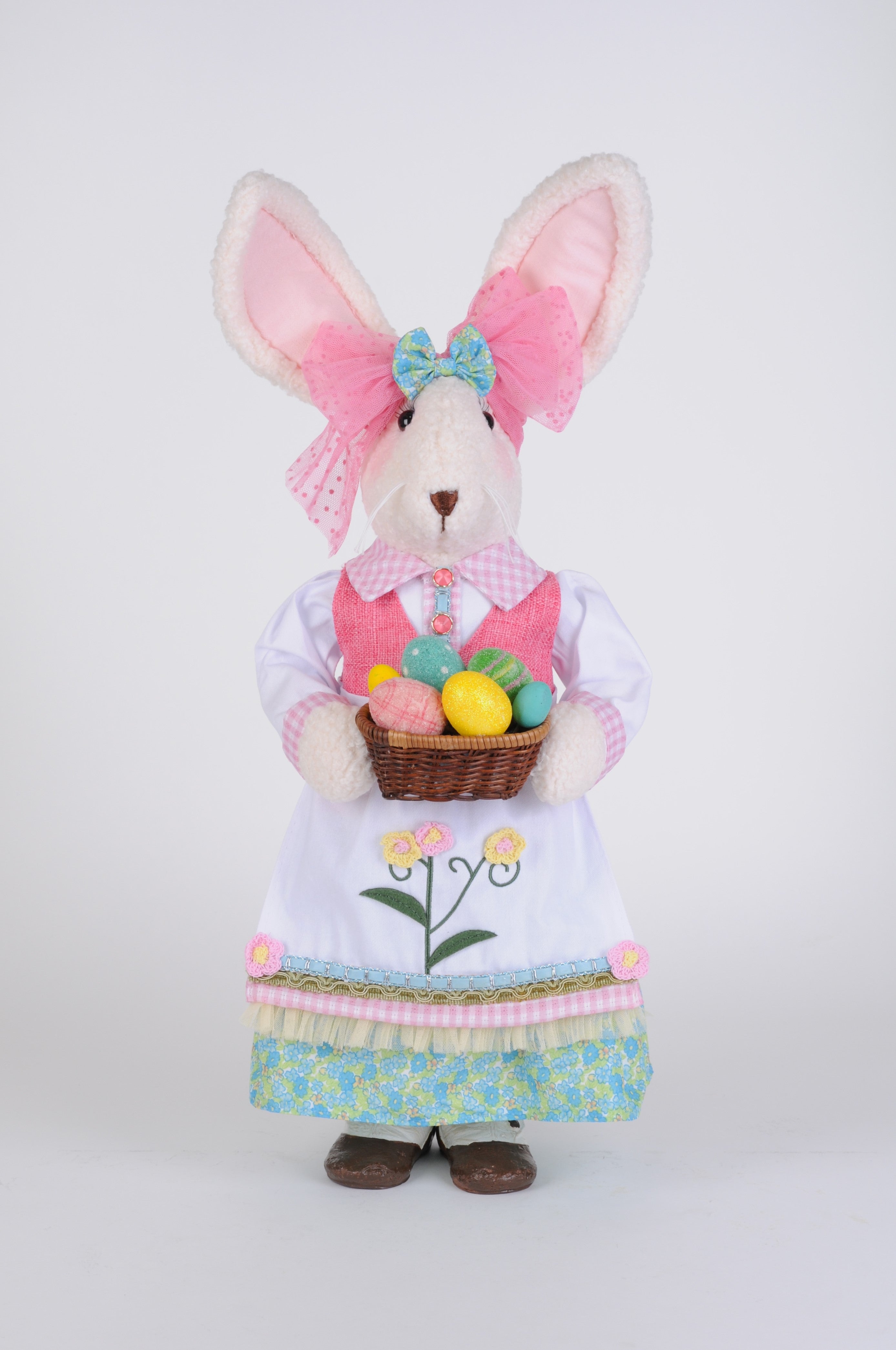 She is adorned with her adorable laced headband and basket full of eggs. Her unique design and charming personality will add character and style to any home.